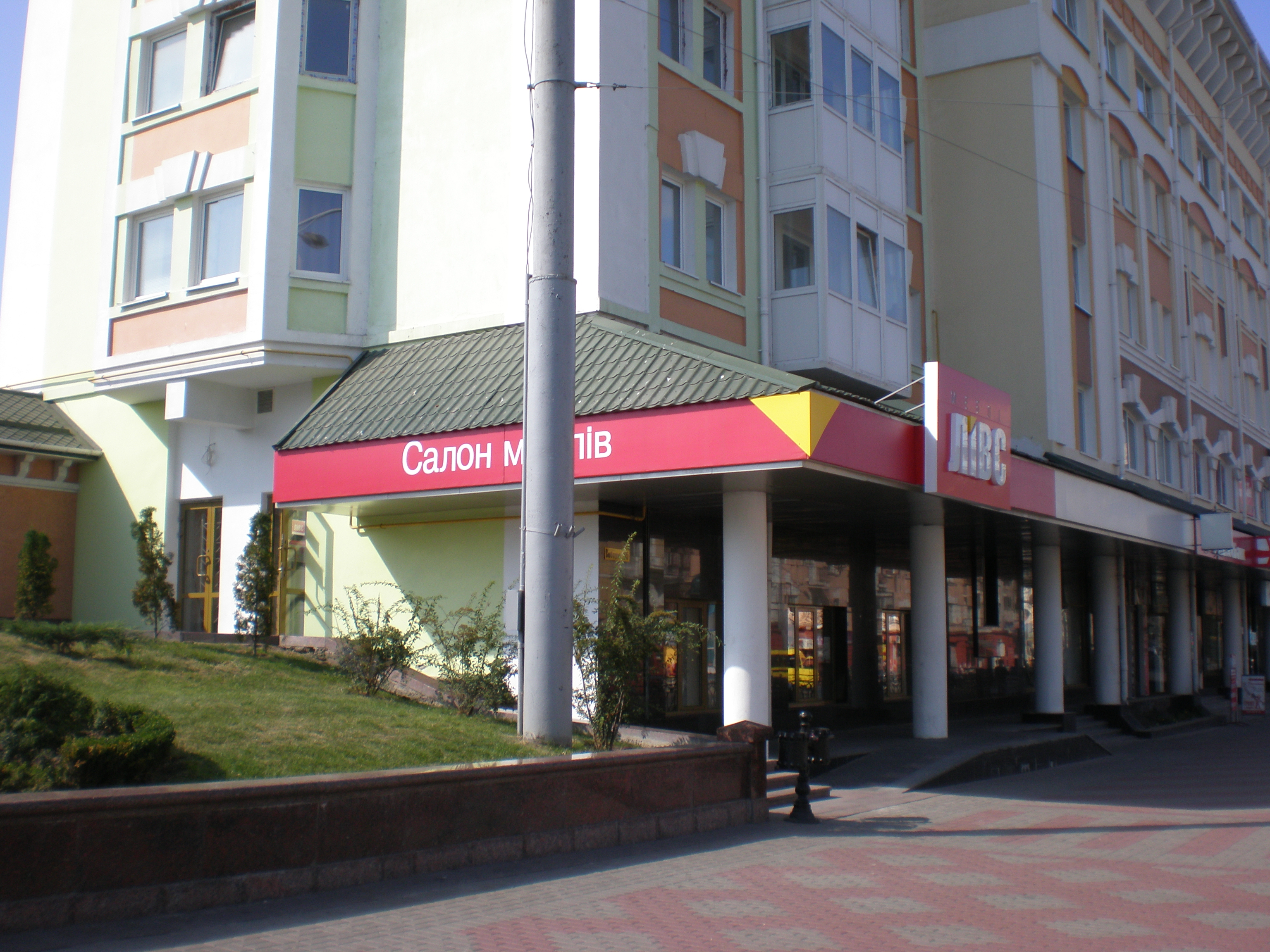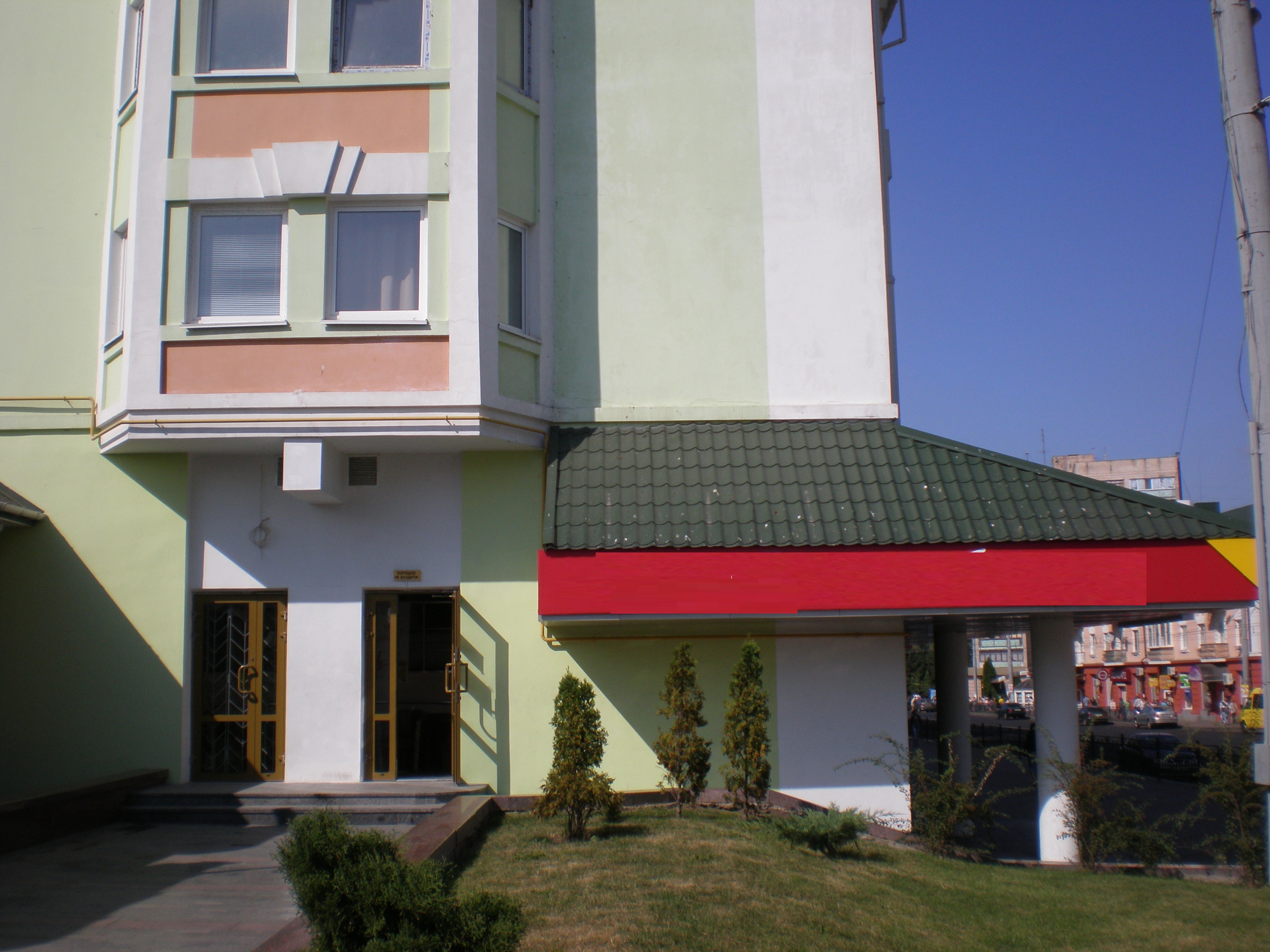 Новое, встроенное в жилой дом здание на центральной улице города.